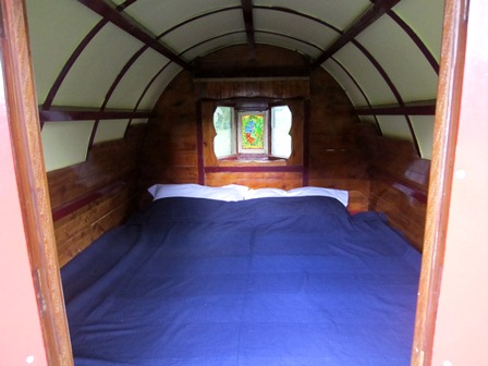 We have also added a lovely new out side bedroom in the form of a beautiful Gypsy wagon which people staying at the Mill Retreat Centre can choose if they want, it has a luxurious huge queens size bed inside and a cosy heater, with stained glass window, and is situated just next to the river and lake, it is just so fun to be in, so we think it will be an idyllic option for people who like to be closer to nature. See photos of outside and inside the wagon.